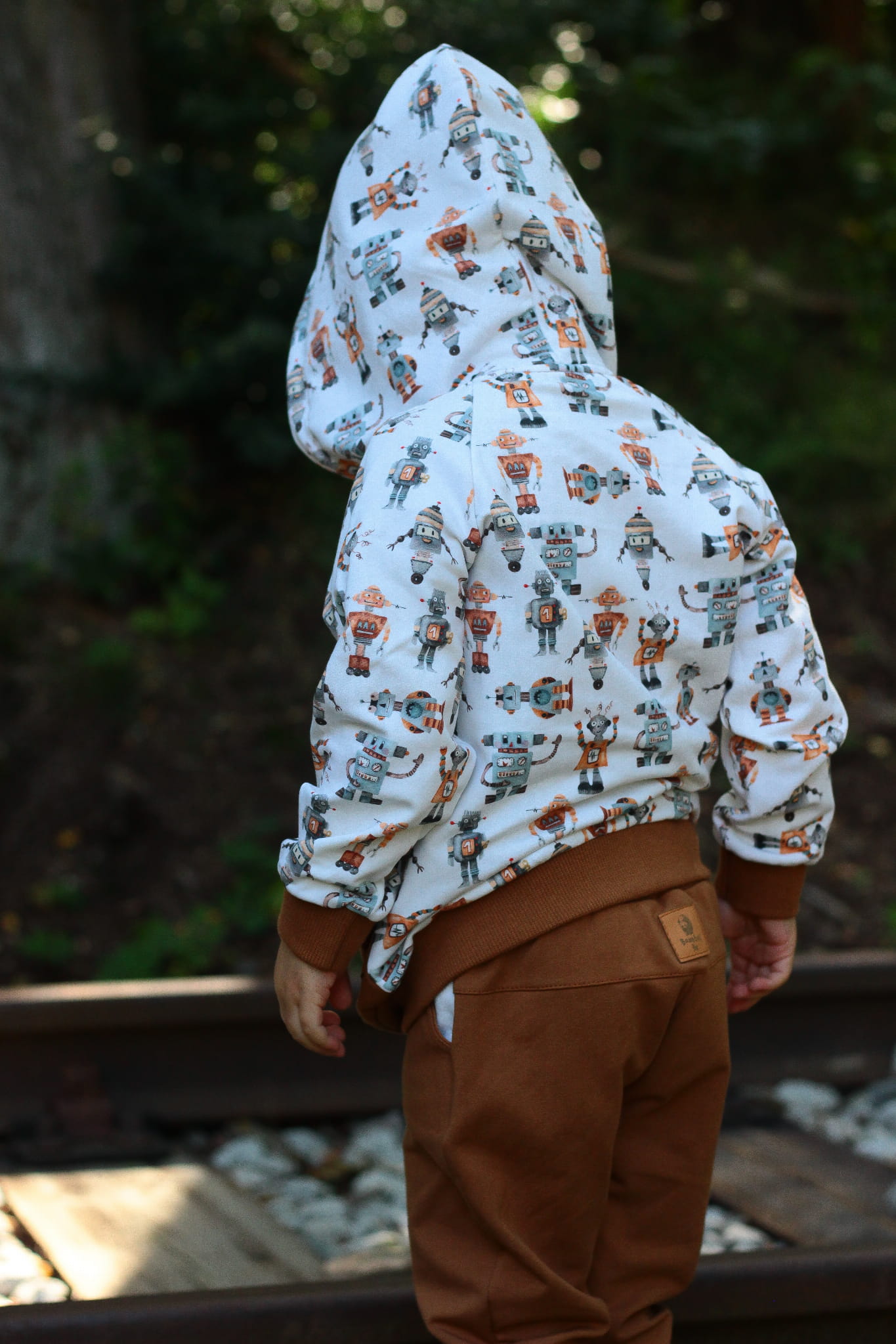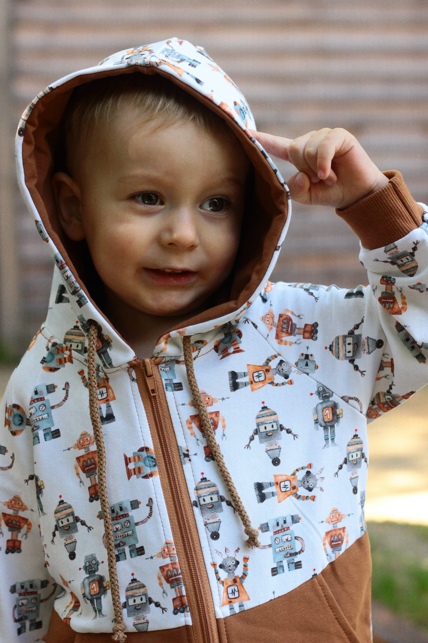 Bluza Roboty ma duży kaptur, a przy nim bawełniane sznurki , więc wiatr i zimny chłodek niestraszny młodym podróżnikom. Wszyty zamek umożliwia szybkie i łatwe ubranie maluszka.
