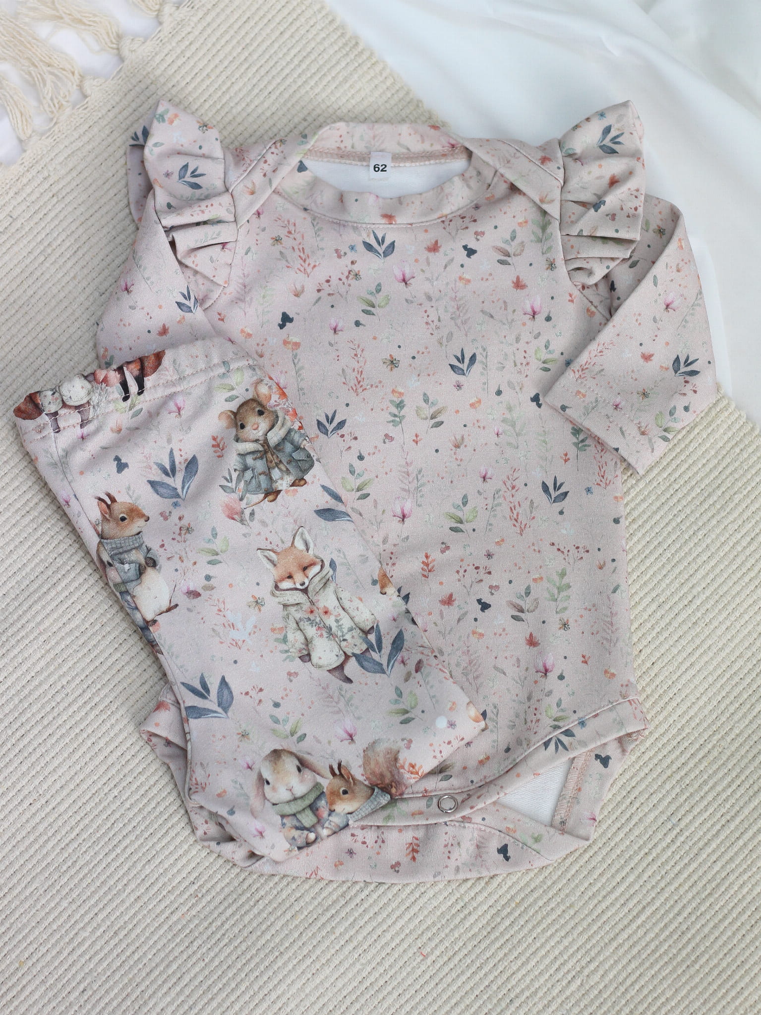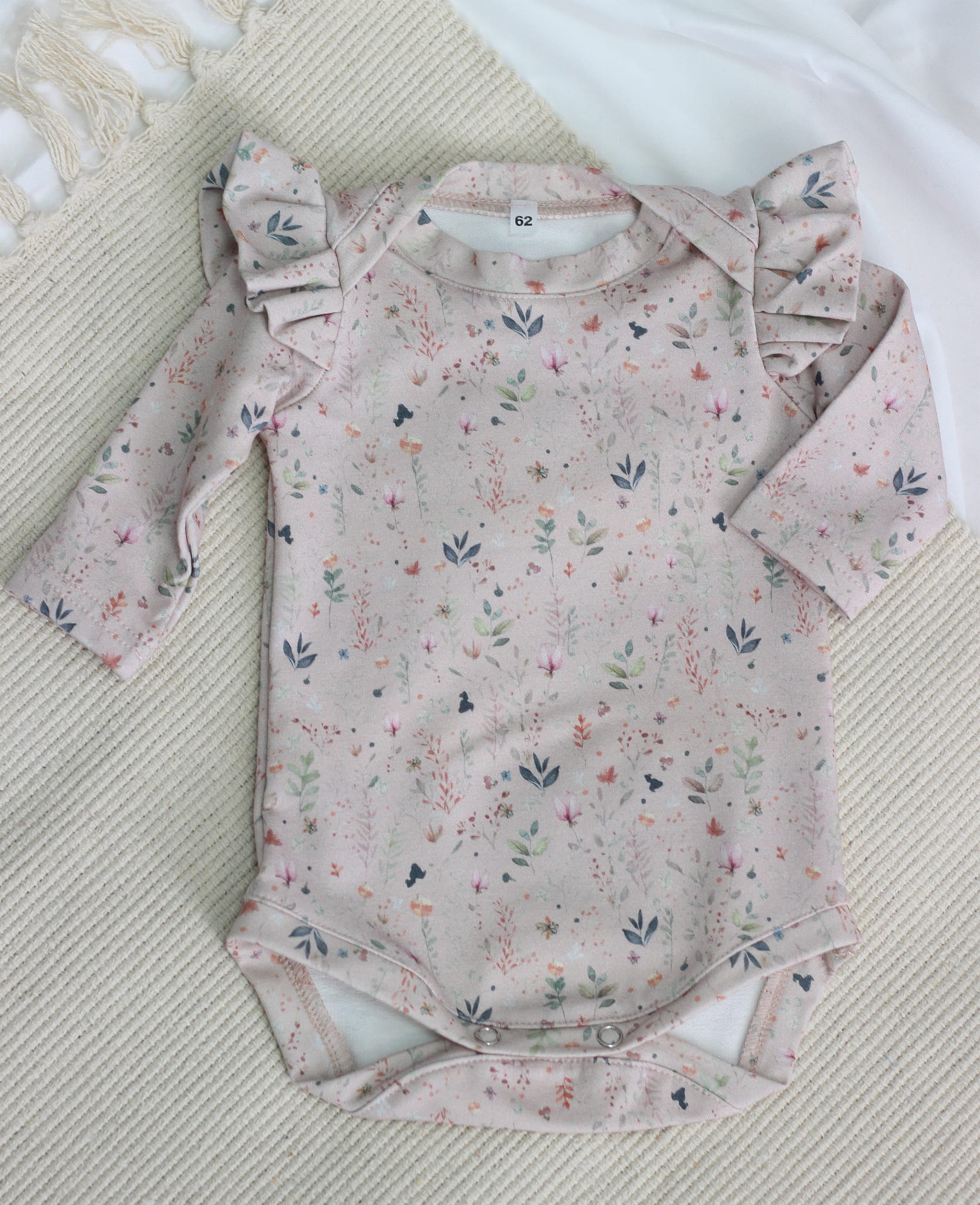 Piękny wzór, który znajduje się na całym ubranku naniesiony jest techniką druku cyfrowego, co sprawia, że nadruk jest niewyczuwalny. Urocze dwustronne falbanki znajdujące się na ramionkach dodają uroku i elegancji.