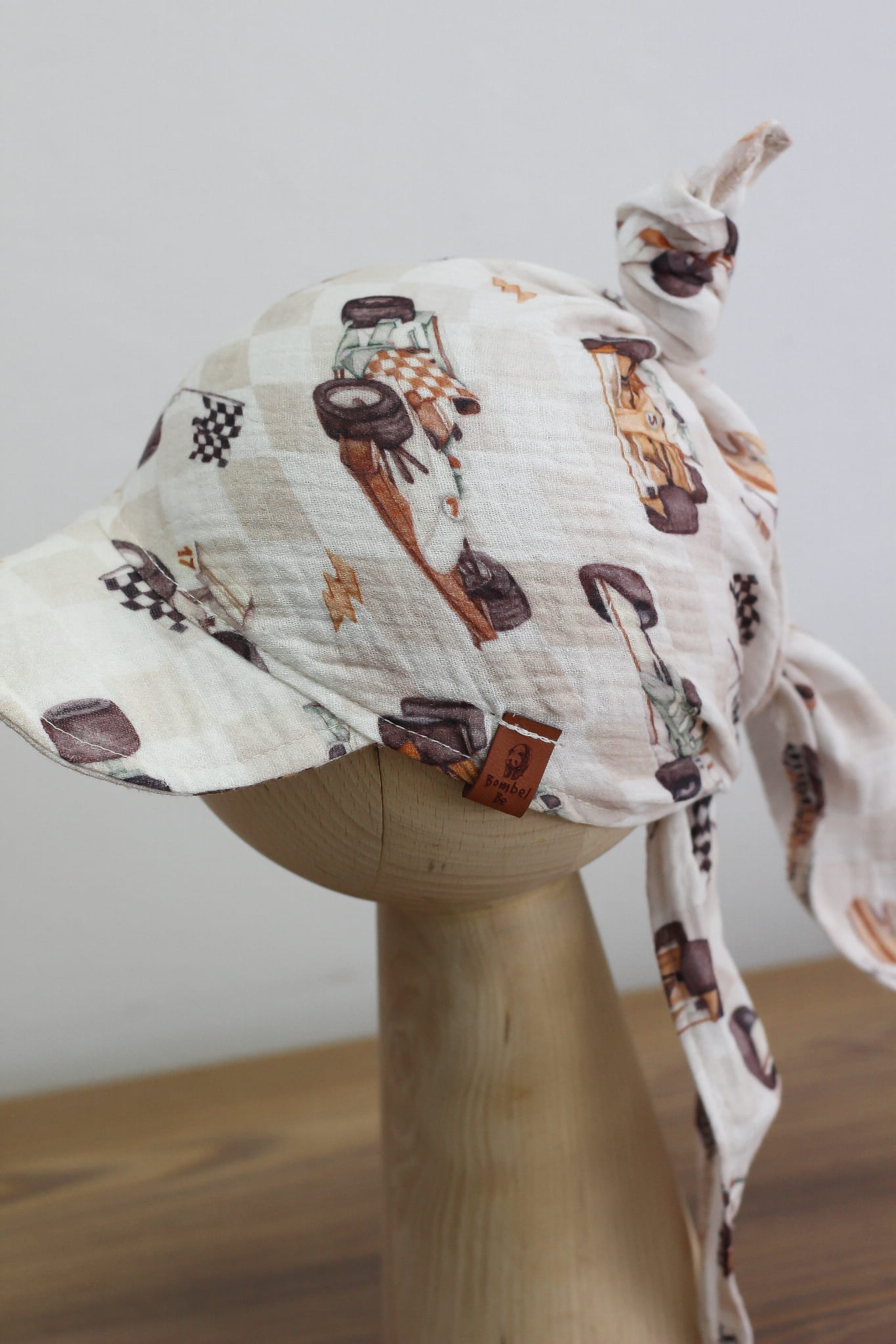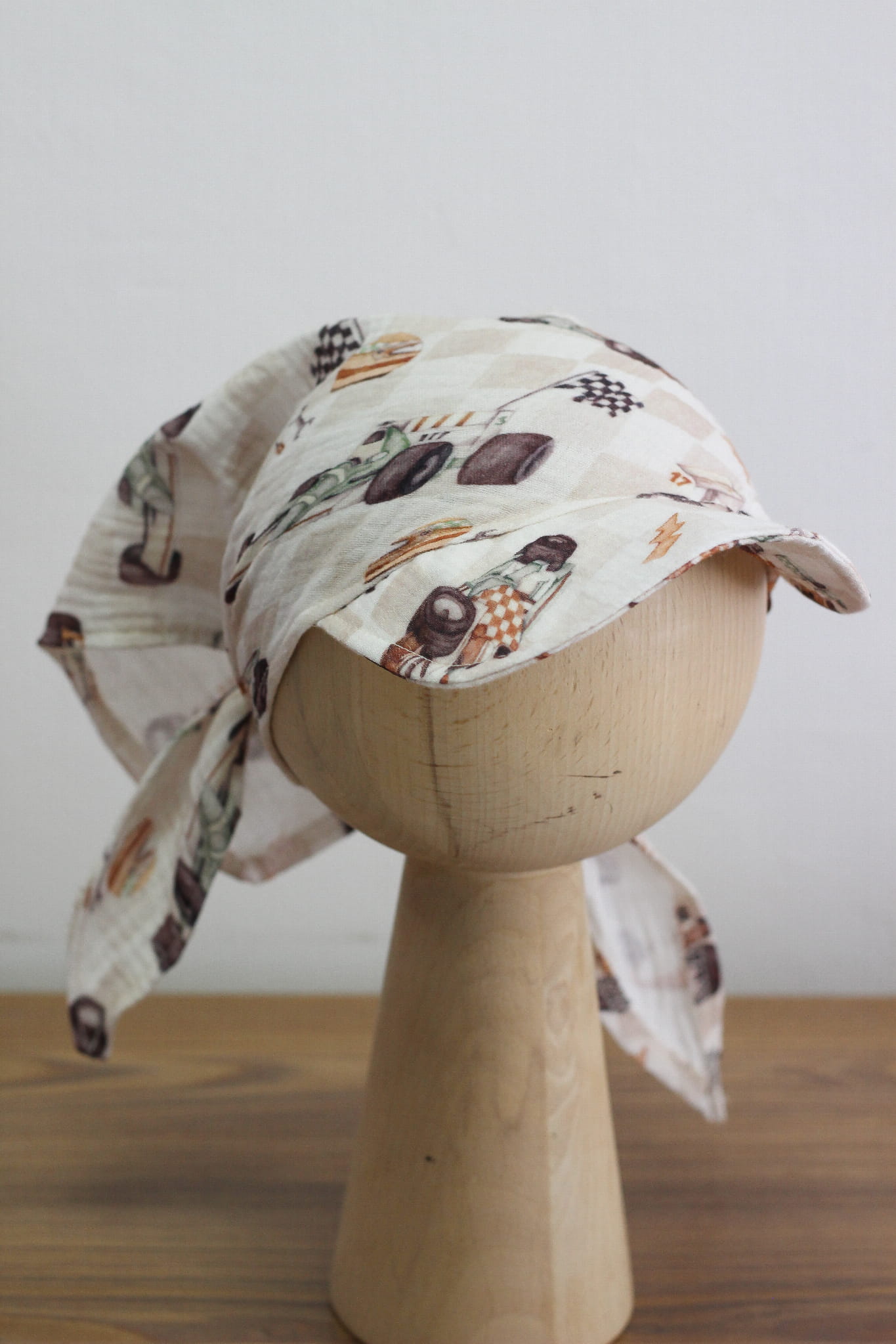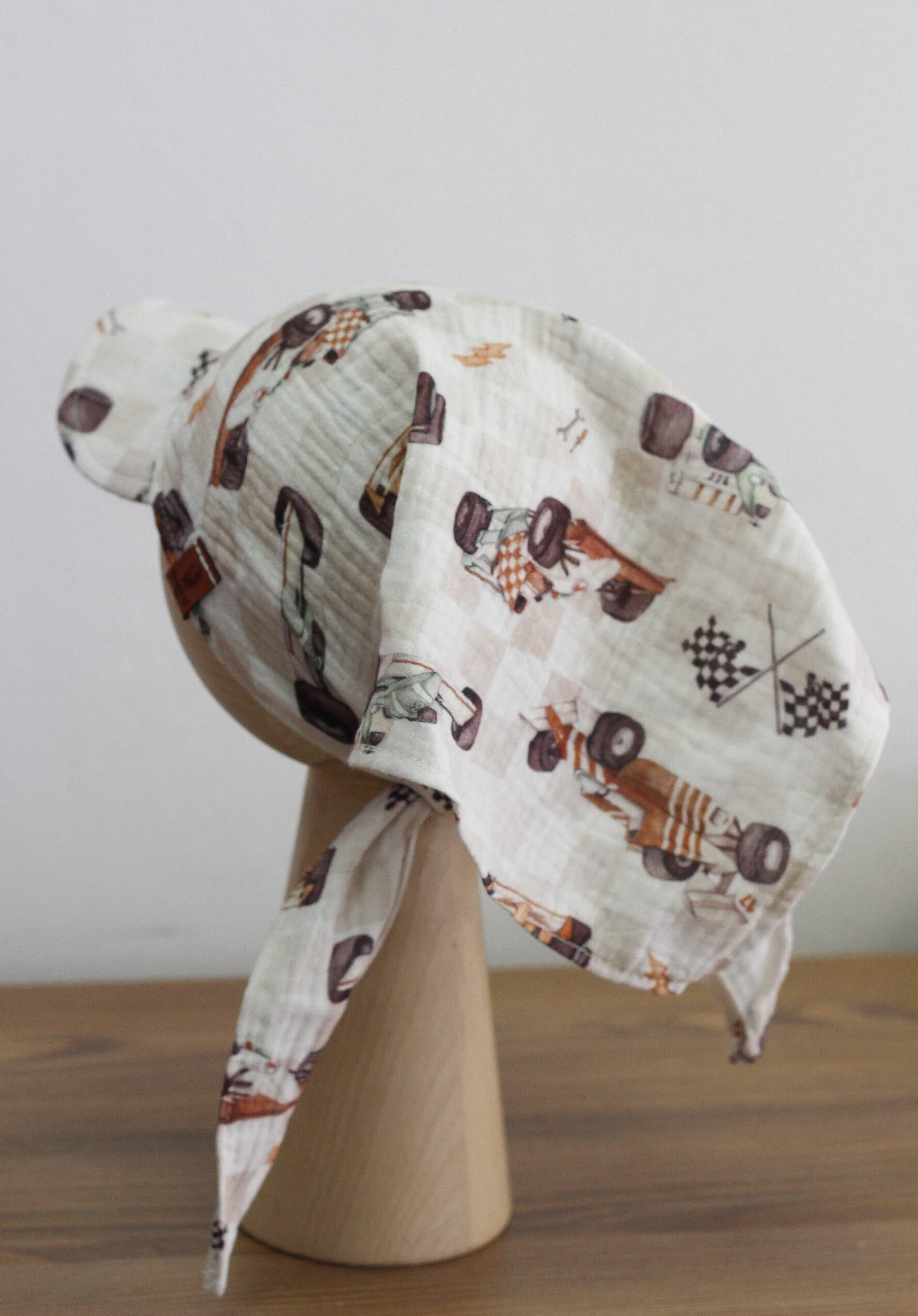 Letnia chusta muślinowa z daszkiem w motyw wyścigowy – wyścigówki, kaski, narzędzia na tle delikatnej kratki. Uszyta ze 100% bawełny. Idealna dla dzieci od ok. 1 do 13 lat.