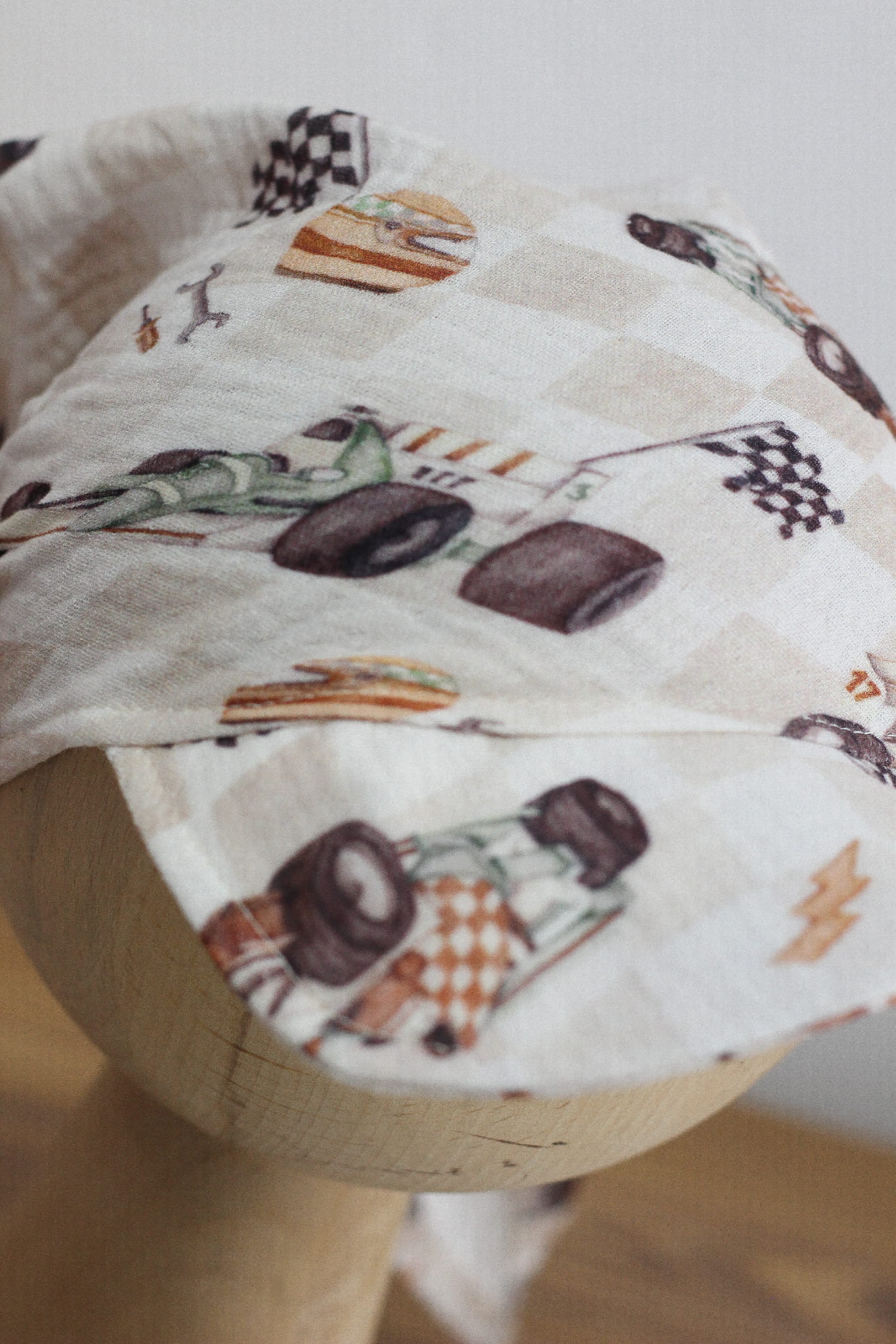 Gotowi do startu? Start! Ta muślinowa chusta z daszkiem w motyw wyścigowy to świetna propozycja dla małych miłośników (i miłośniczek!) rajdów, samochodów i mechaniki. Wzór przedstawia przeróżne wyścigówki, narzędzia, kaski i akcesoria, a wszystko to na tle drobnej kratki – subtelnie sportowy, ale dziecięcy design, który przyciąga uwagę.