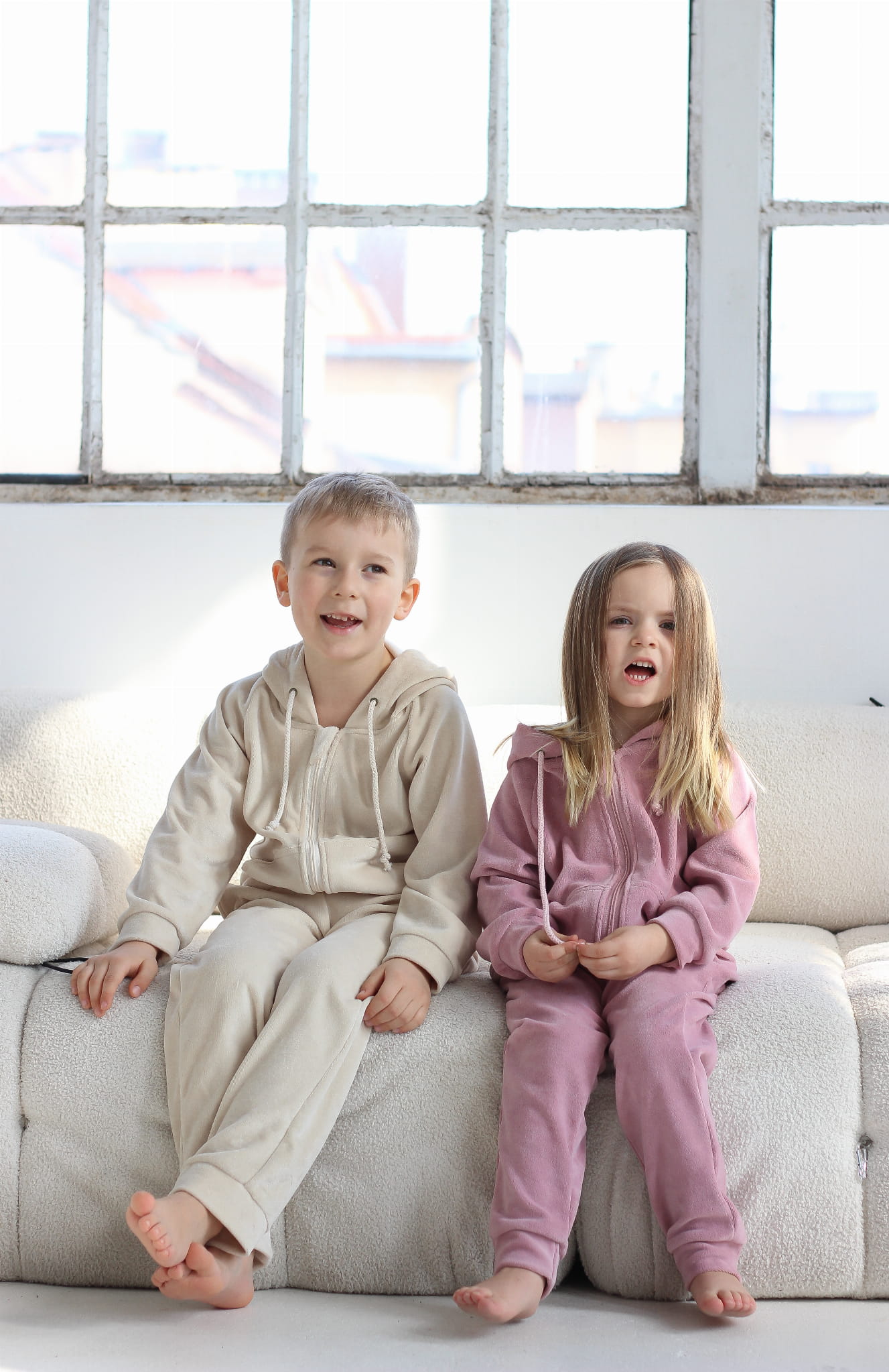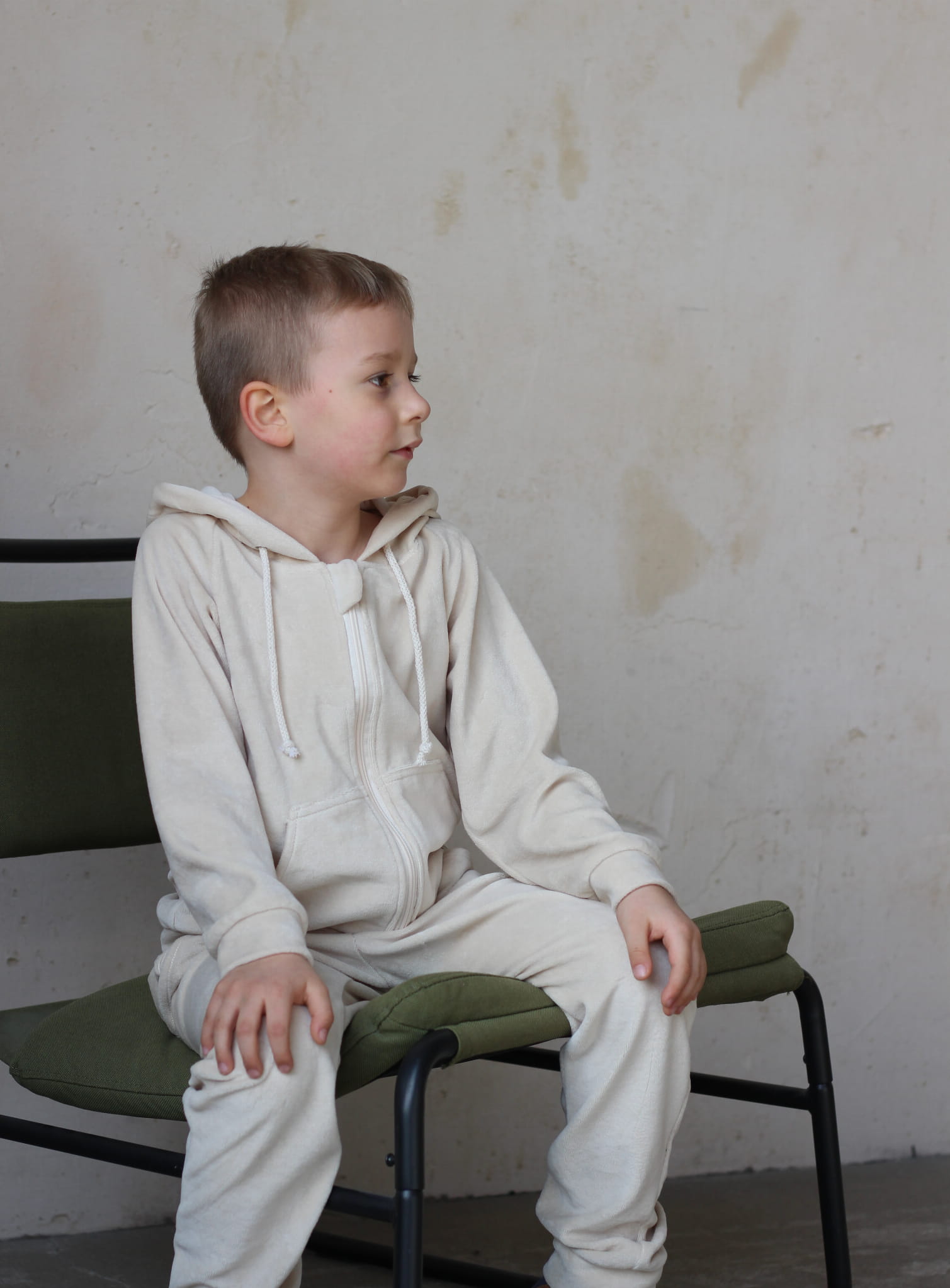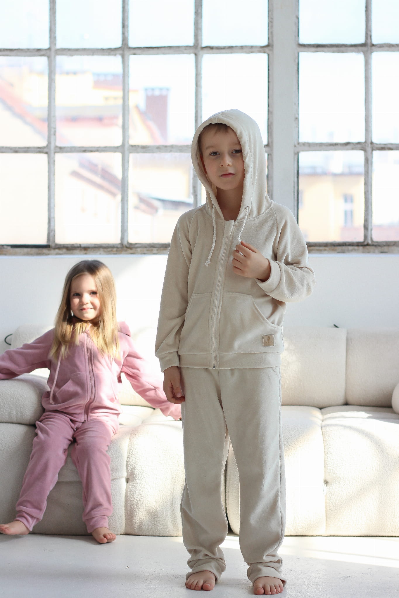 Dres welurowy dziecięcy – jasny beż, bawełniany welur, zamek, regulowany kaptur