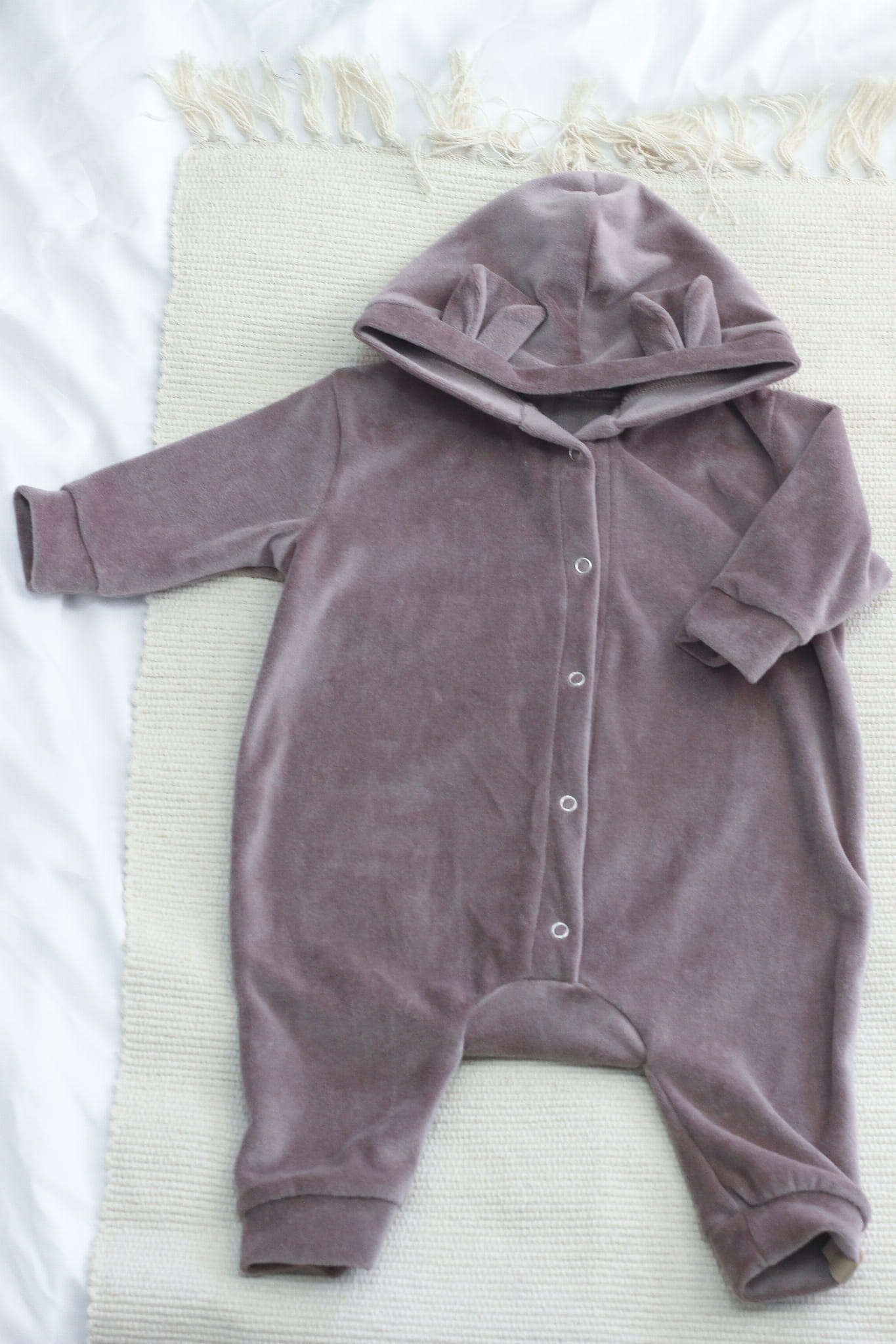 Lawendowy kombinezon niemowlęcy z bawełnianego weluru to połączenie miękkości, wygody i uroku. Zapinany na napy, z kapturkiem ozdobionym uszkami misia. Idealny na chłodniejsze dni, dostępny w rozmiarach 56/62, 68/74 i 80/86.