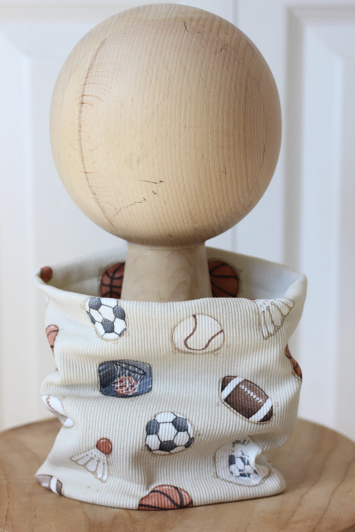 Elastyczny komin dziecięcy z bawełnianej dzianiny we wzór piłek i lotek – idealny dla chłopca na wiosnę i chłodniejsze dni. Nie uwiera, łatwo się zakłada, dobrze przylega do szyi. Stanowi świetne uzupełnienie czapki i opaski z tej samej kolekcji. Wykonany ręcznie z dzianiny z certyfikatem OEKO-TEX®.