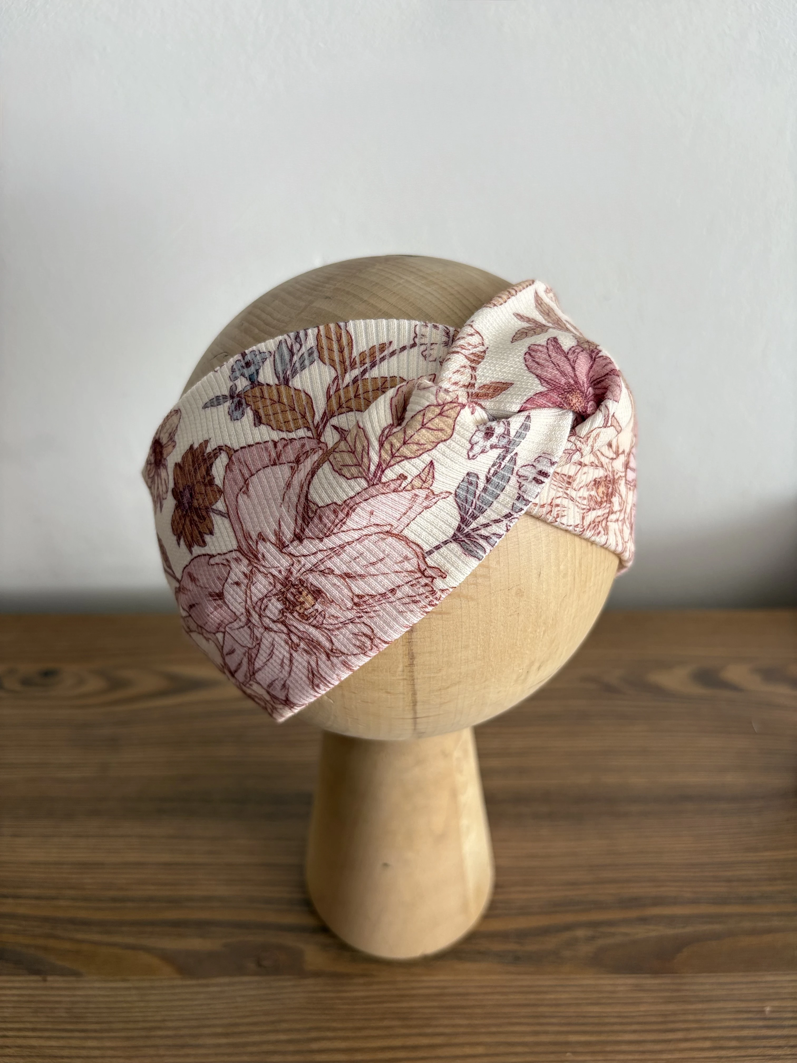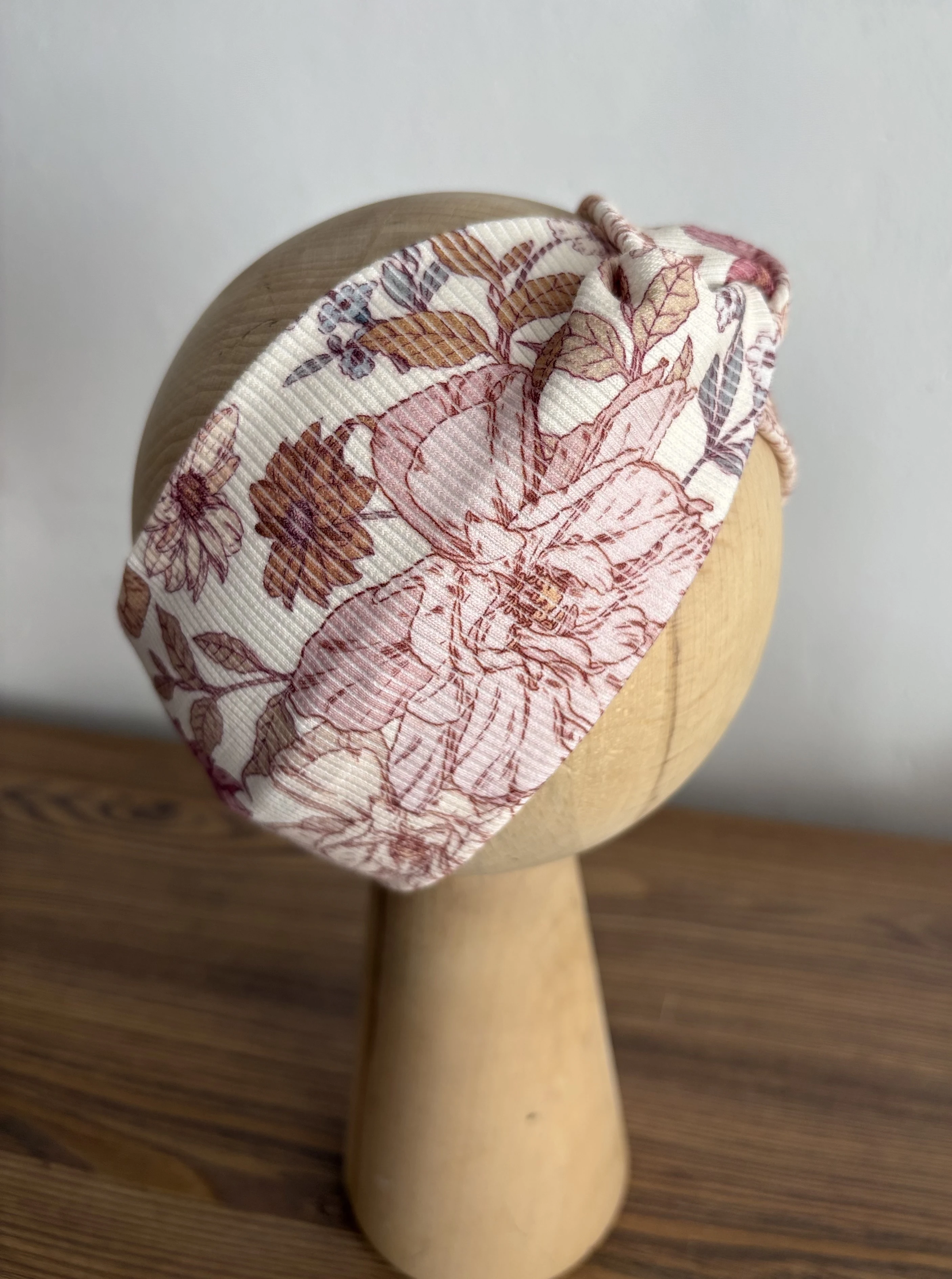 Elastyczna opaska przeplotka w kwiatowy wzór Retro Flowers. Miękka, wygodna i stylowa – idealna dla dziewczynek i kobiet.