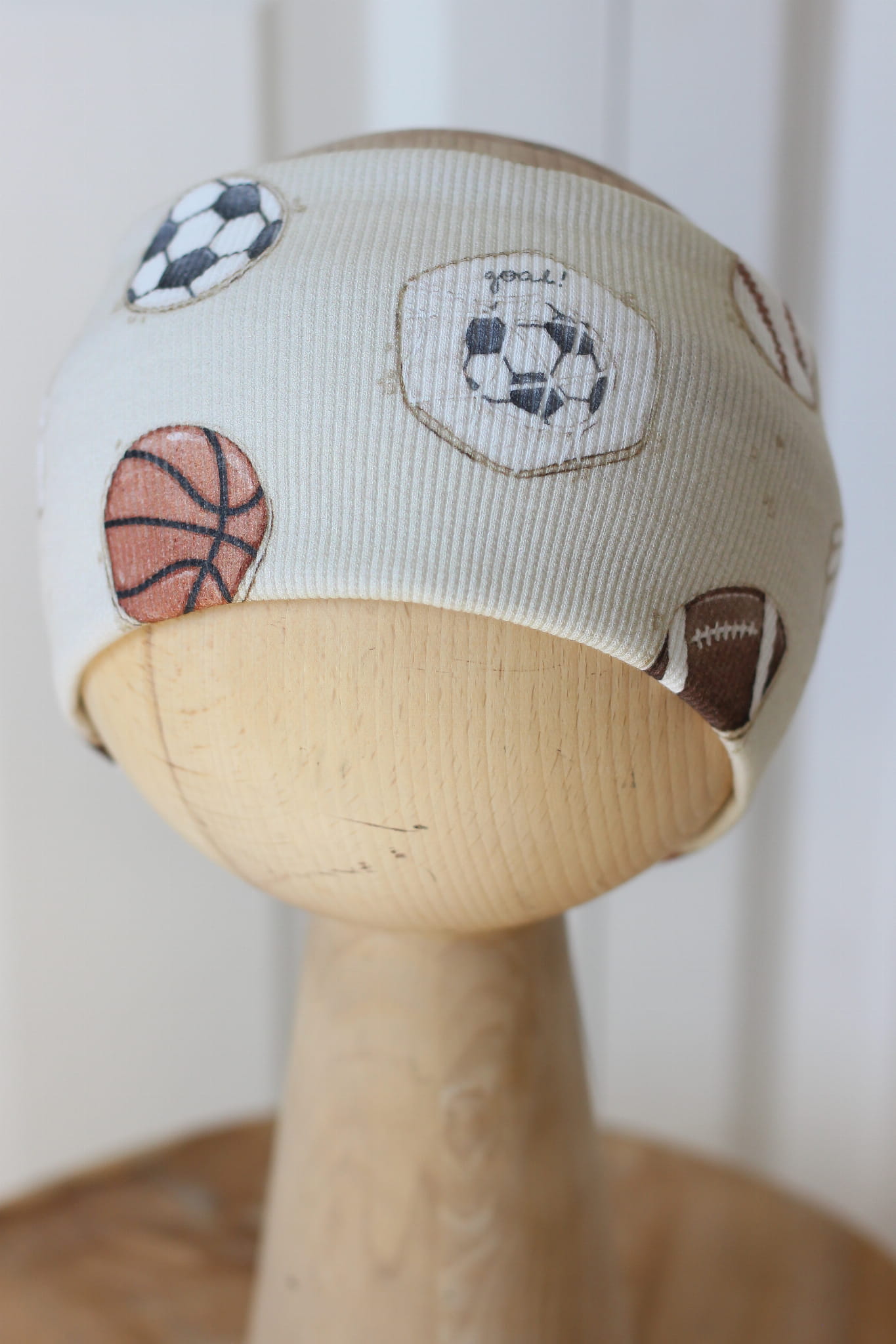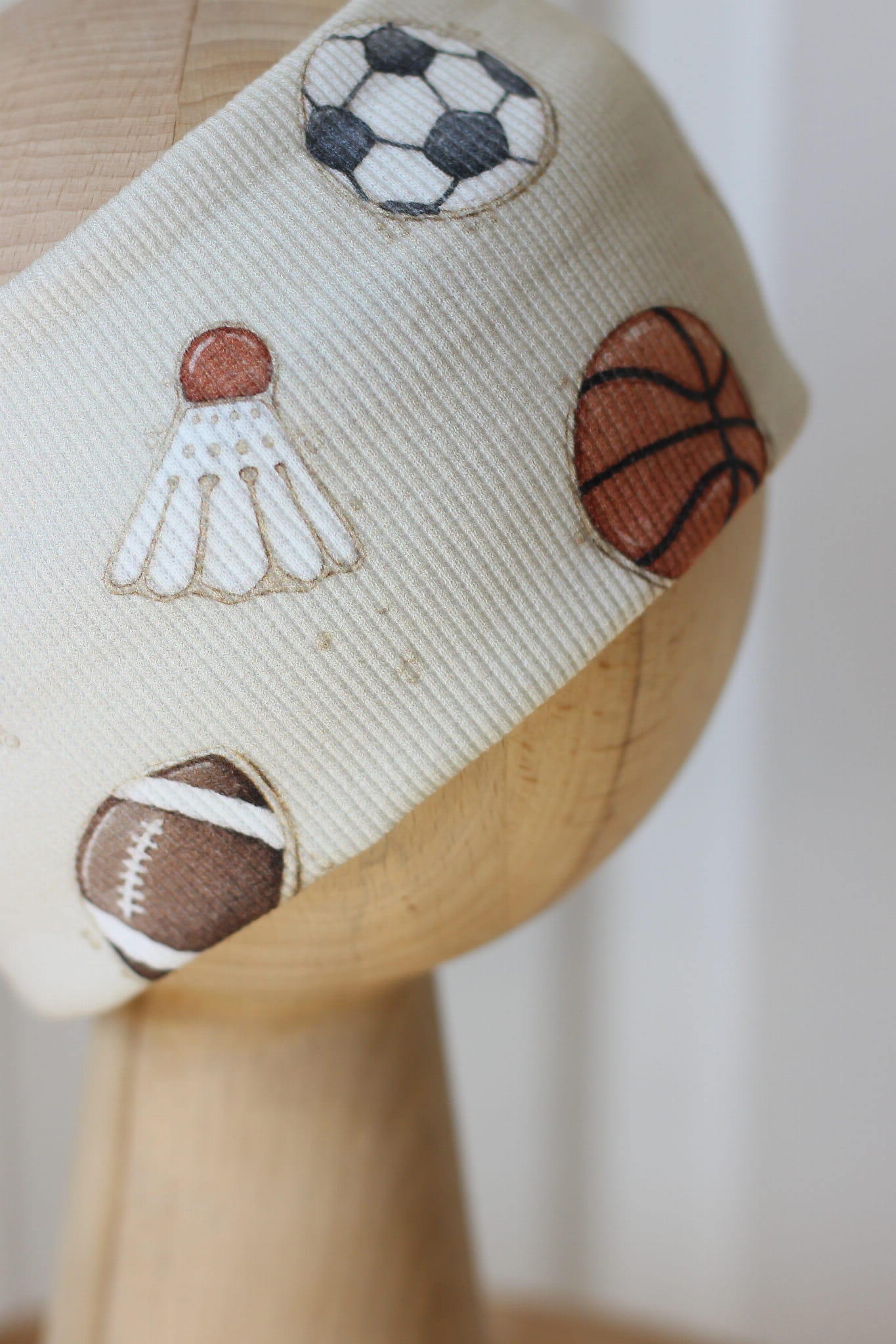 Szeroka opaska dla chłopca z motywem piłek do różnych dyscyplin. Prążkowana dzianina i sportowy styl na wiosenne dni.
