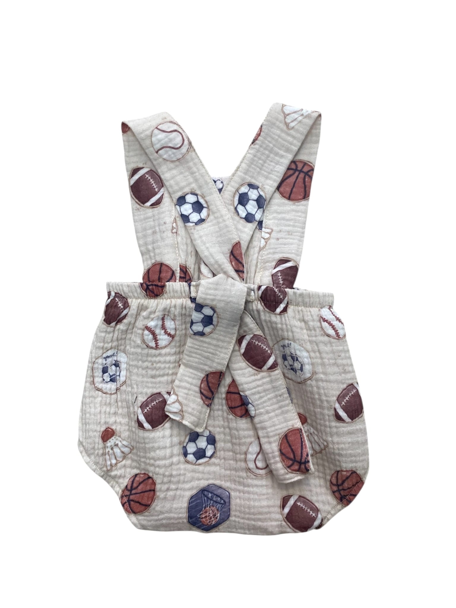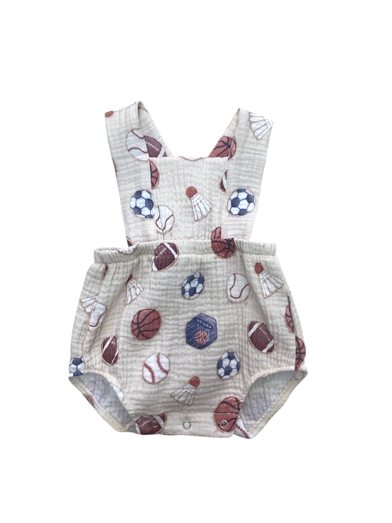 Rampers z muślinu dla chłopca z motywem piłek na beżowym tle – lekki, przewiewny i wygodny na ciepłe dni. Uszyty w Polsce z certyfikowanej bawełny OEKO-TEX®. Naturalny wybór dla małego sportowca!