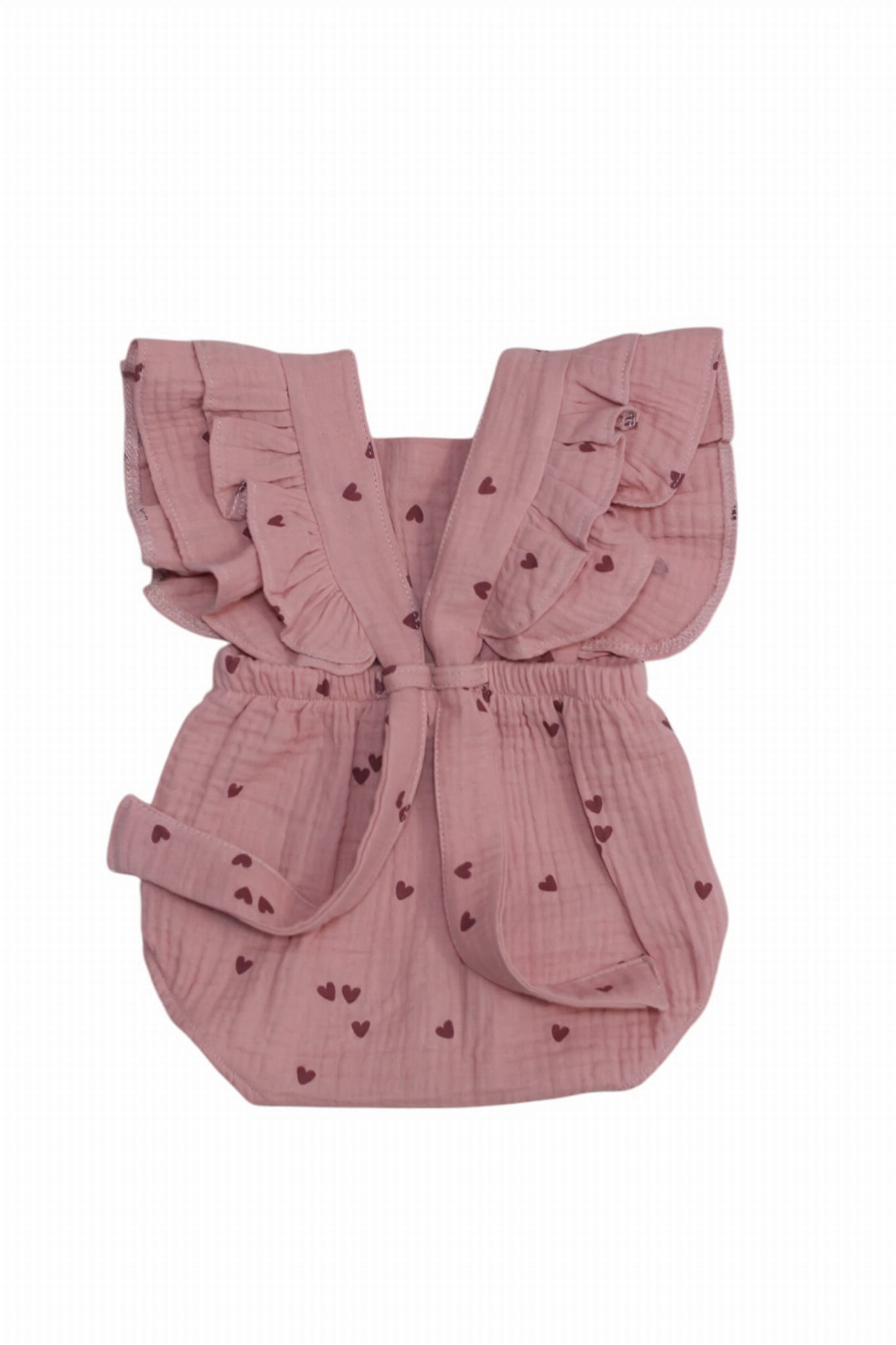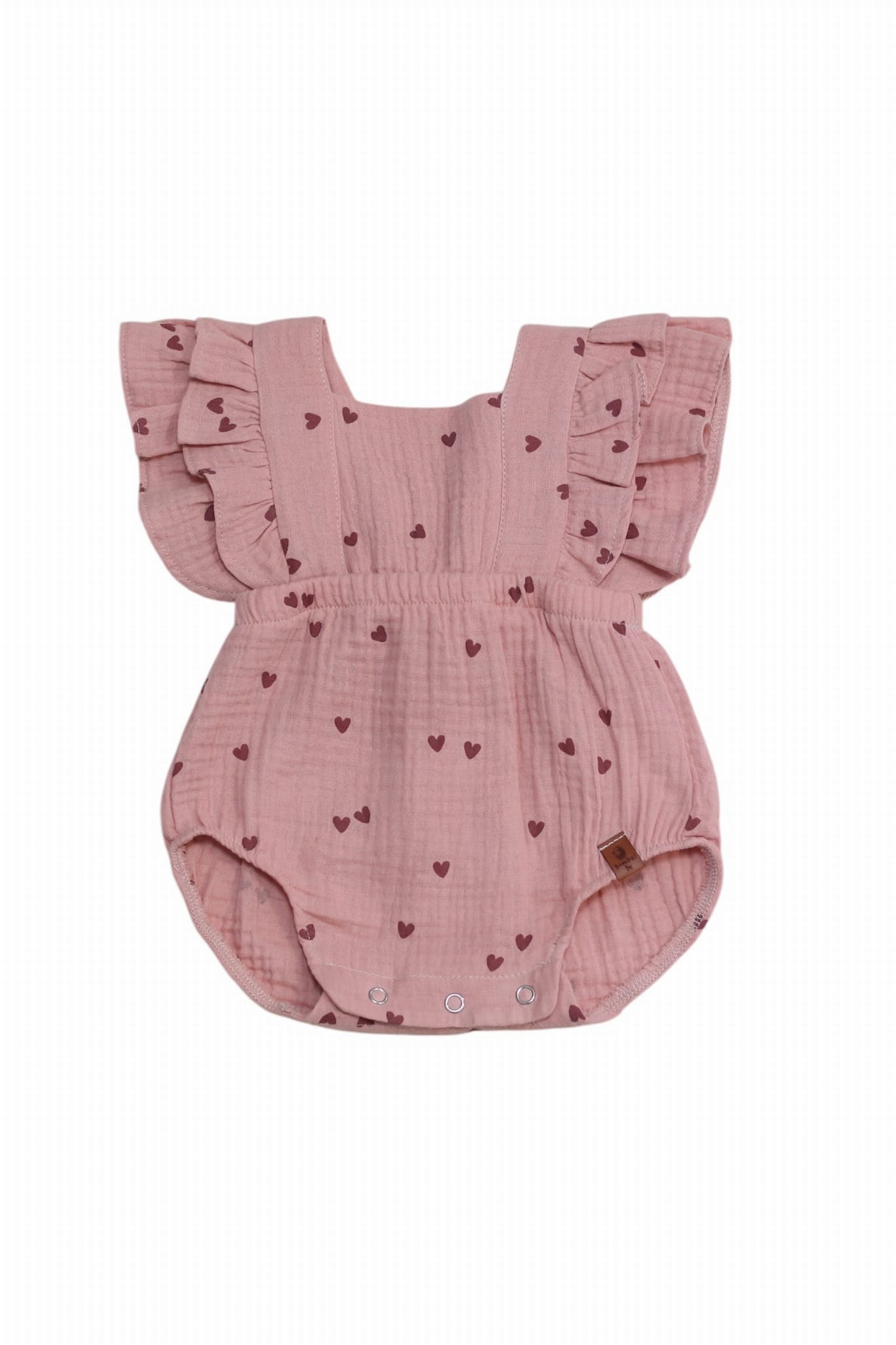 Letni rampers niemowlęcy wykonany z certyfikowanego, bawełnianego muślinu OEKO-TEX®, w kolorze brudnego różu z uroczym wzorem drobnych serduszek.
