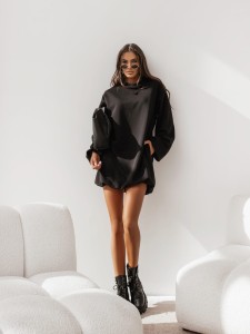 Model wyróżnia się lekko zaokrąglonym dołem oraz szerokimi rękawami zakończonymi efektem “balonika”, które nadają całości nowoczesnego i modnego charakteru. Oversize’owy krój sprawia, że sukienka świetnie pasuje na różne typy sylwetek, maskując ewentualne niedoskonałości i podkreślając swobodny, miejski styl.