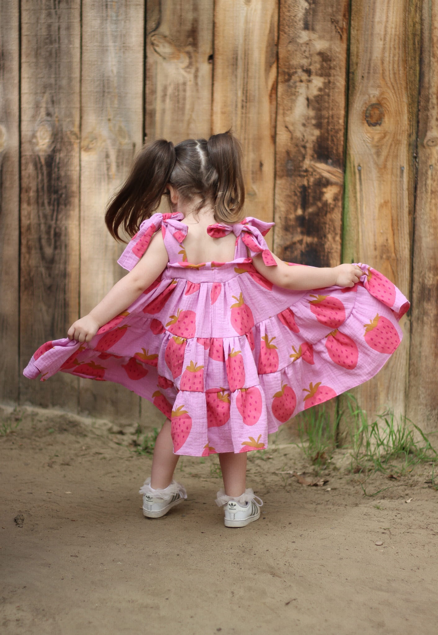 Przepiękna sukienka muślinowa dla dziewczynek. Uszyta z miękkiego i przyjaznego w dotyku bawełnianego muślinu. Sukienka dla dziewczynki posiada aż 3 duże falbany, co sprawia że pięknie się kręci, a do tego jest bardzo wygodna.