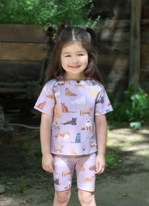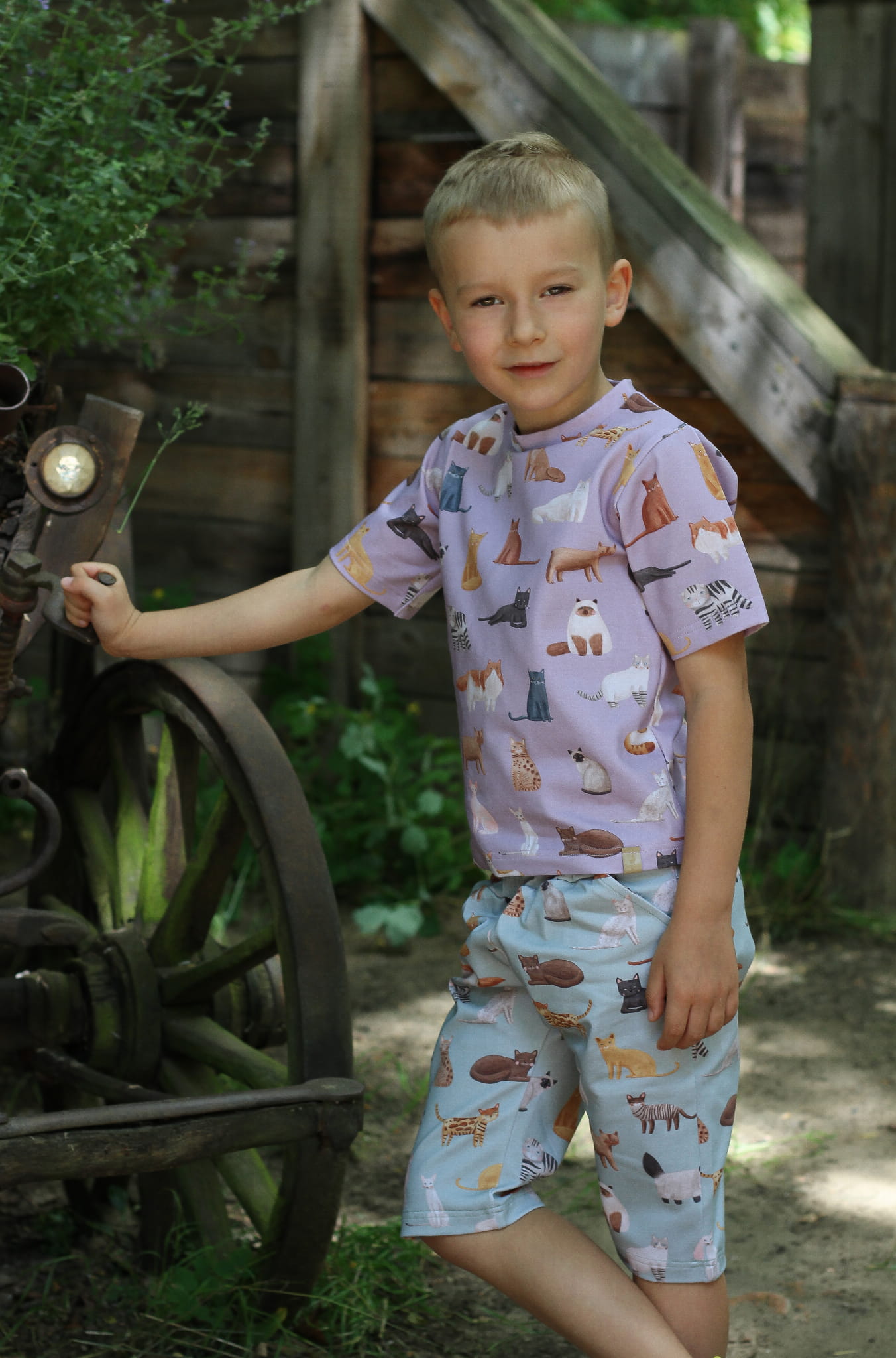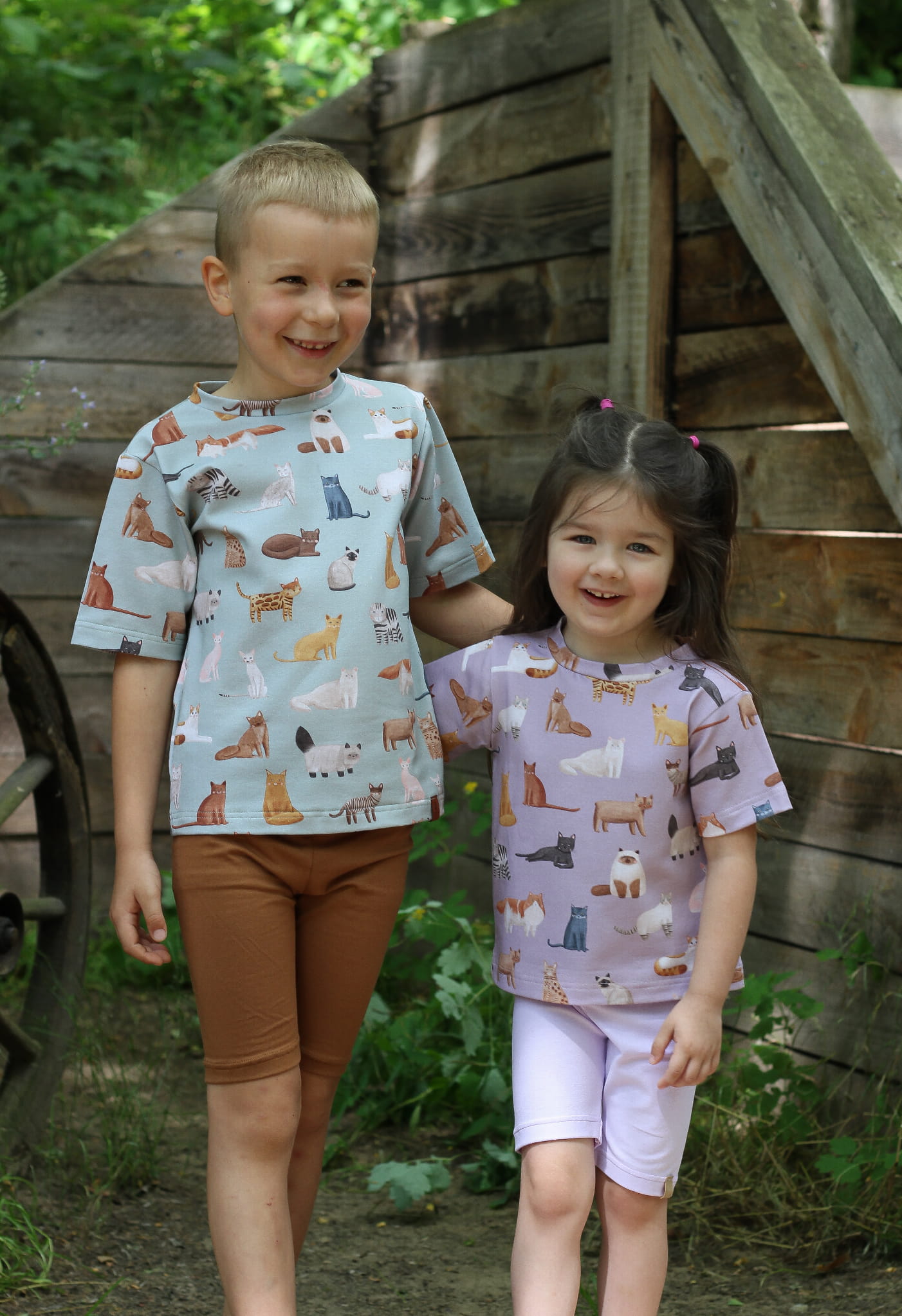 Fioletowy t-shirt dziecięcy z nadrukiem kotków. Miękka, przewiewna bawełna z OEKO-TEX® – wygoda i styl na lato. Ręcznie szyty w Polsce.